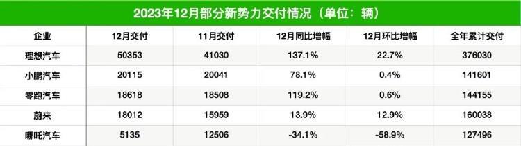 哪吒汽車在2023年12月僅交付5135輛新車,同比下滑34.1%,是當(dāng)月唯一銷量同比下滑的造車新勢(shì)力。2023年全年,哪吒汽車共交付新車約12.7萬(wàn)輛,未能完成此前制定的25萬(wàn)輛的年度銷售目標(biāo)。