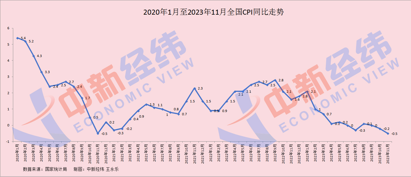 國(guó)家統(tǒng)計(jì)局?jǐn)?shù)據(jù)顯示,2023年11月,全國(guó)CPI環(huán)比下降0.5%,同比下降0.5%。CPI同比連續(xù)兩月處于負(fù)值區(qū)間,且二次探底,創(chuàng)2020年12月以來最大降幅。