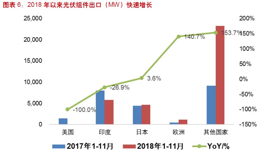 中國(guó)光伏行業(yè)協(xié)會(huì)的數(shù)據(jù)顯示,2018年光伏產(chǎn)品(硅片、電池片、組件)出口總額達(dá)161.1億美元,創(chuàng)下歐美“雙反”后最高水平,同比增長(zhǎng)10.9%。組件市場(chǎng)方面,光伏市場(chǎng)出口集中度繼續(xù)下降,形成傳統(tǒng)市場(chǎng)和新興市場(chǎng)(南美、中東北非)結(jié)合的多元化市場(chǎng)傳統(tǒng)市場(chǎng)方面,因歐盟取消了長(zhǎng)達(dá)五年的“雙反”政策,歐洲市場(chǎng)復(fù)蘇,對(duì)荷蘭、德國(guó)、英國(guó)等歐洲主要國(guó)家的組件出口同比增長(zhǎng),對(duì)烏克蘭、西班牙的組件出口大幅增長(zhǎng)。中國(guó)光伏行業(yè)協(xié)會(huì)預(yù)測(cè),歐盟市場(chǎng)2019年增速明顯增高,可達(dá)11GW,西班牙等啟動(dòng)平價(jià)上網(wǎng)項(xiàng)目,法國(guó)、荷蘭、意大利等也將有較大幅度增長(zhǎng)。