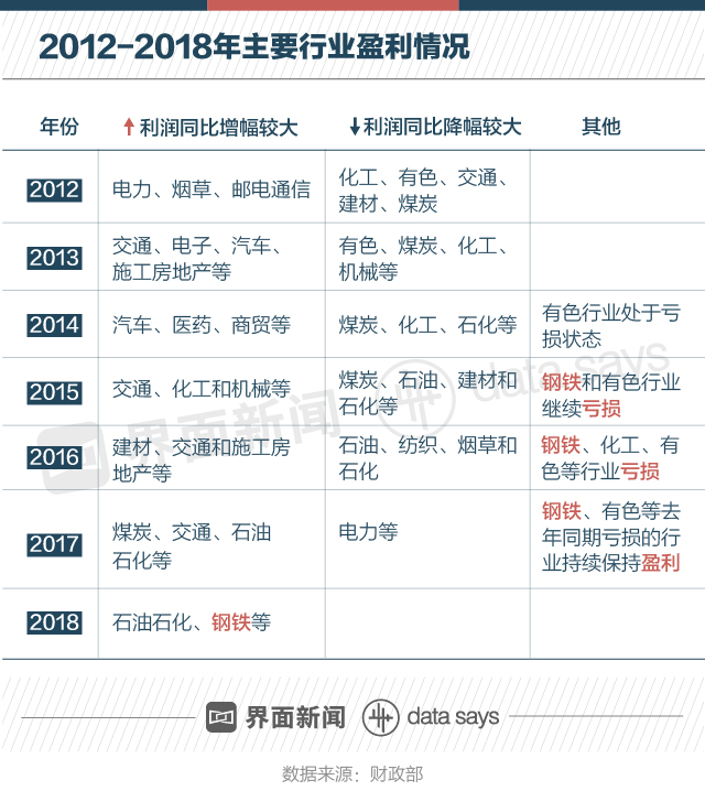 從盈利行業(yè)情況來看,2018年,財政部報告中所列利潤同比增幅較大行業(yè)僅有石油石化、鋼鐵2個。