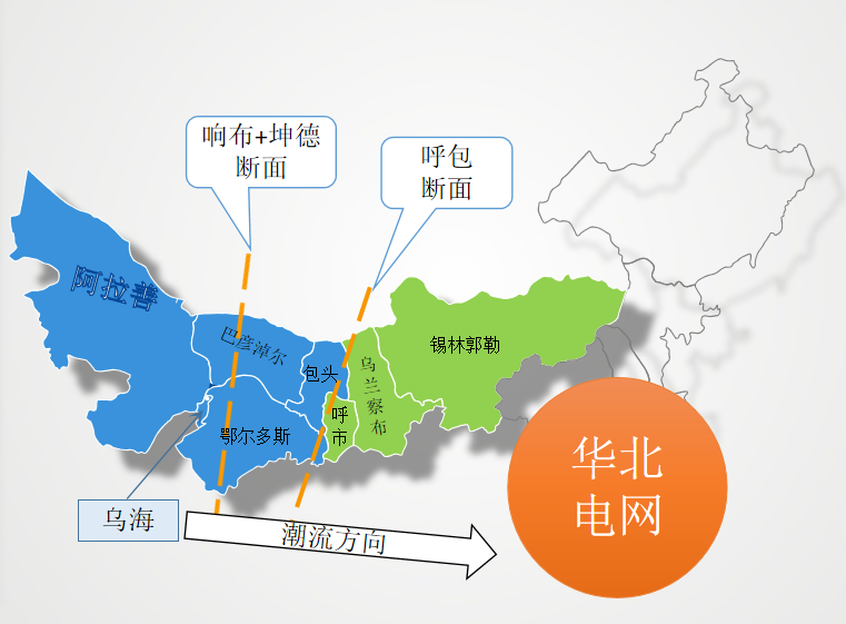 圖2 蒙西電網(wǎng)斷面及潮流方向示意圖