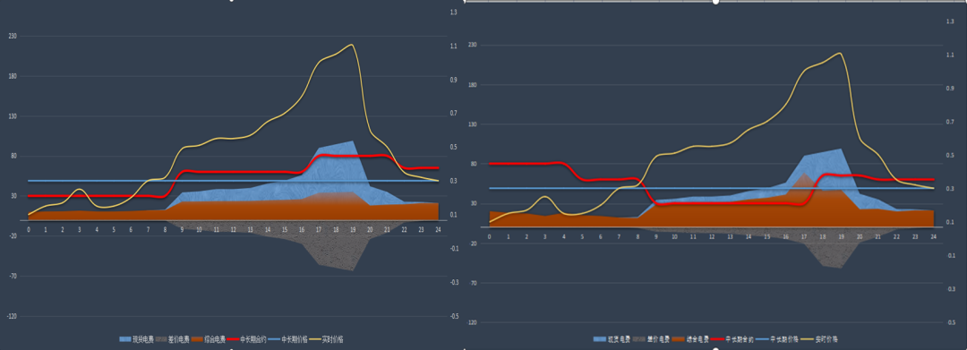 當(dāng)市場(chǎng)來(lái)臨的時(shí)候,部分國(guó)有發(fā)電企業(yè)的經(jīng)營(yíng)模式并沒(méi)有調(diào)整到位,可能存在經(jīng)營(yíng)決策失誤的原因。例如,中長(zhǎng)期簽約時(shí)未充分考慮自身節(jié)點(diǎn)和用戶(hù)側(cè)現(xiàn)貨價(jià)格的差異,不同發(fā)電企業(yè)、不同用戶(hù)一個(gè)策略,簡(jiǎn)單粗暴,不管簽?zāi)牡挠脩?hù)都是一個(gè)價(jià),只重視合同價(jià)格的高低,不考慮價(jià)差電費(fèi)的高低,有些甚至不在合同中約定分時(shí)價(jià)格。如圖4所示,左圖與右圖用戶(hù)電量相同,左圖用戶(hù)合同價(jià)為0.4元/度,右圖用戶(hù)合同價(jià)為0.3元/度,兩個(gè)用戶(hù)用電曲線(xiàn)形狀不同,其他均相同。從大烏海區(qū)域部分電源的選擇來(lái)看,顯然更喜歡左圖用戶(hù),然而事實(shí)卻告訴我們:由于右圖用戶(hù)價(jià)差電費(fèi)要遠(yuǎn)高于左圖用戶(hù)的價(jià)差電費(fèi),最終的結(jié)算結(jié)果是合同價(jià)低25%的右圖用戶(hù)可以為電源帶來(lái)的電費(fèi)(紅色部分)高于左圖用戶(hù)。