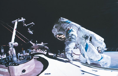 12月21日在北京航天飛行控制中心拍攝的神舟十七號(hào)航天員唐勝杰開展艙外操作的畫面。(新華社發(fā))