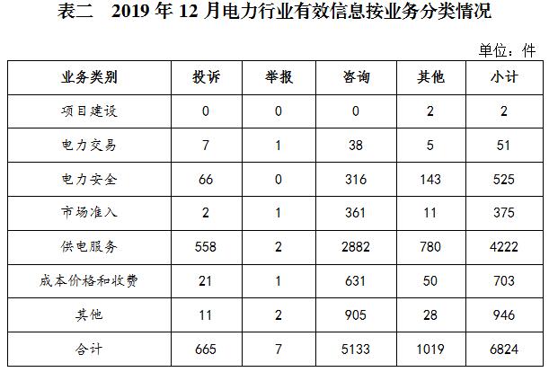 電力行業(yè)排在首位,有效信息數(shù)量為6824件,占全部有效信息的81.05%;其中受理的投訴舉報數(shù)量為672件,占全部投訴舉報數(shù)量的97.39%。群眾反映的問題主要集中在供電服務(wù)、電力安全、成本價格和收費等方面。(2019年11月電力行業(yè)有效信息按業(yè)務(wù)分類情況見表二)