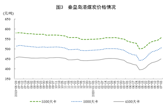 港口煤炭綜合交易價(jià)格持續(xù)回升。7月3日,秦皇島港5500大卡、5000大卡和4500大卡煤炭?jī)r(jià)格分別為每噸556元、506元和450元,比5月29日回升28元、33元和28元。