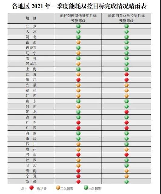 《各地區(qū)2021年一季度能耗雙控目標完成情況晴雨表》的通知