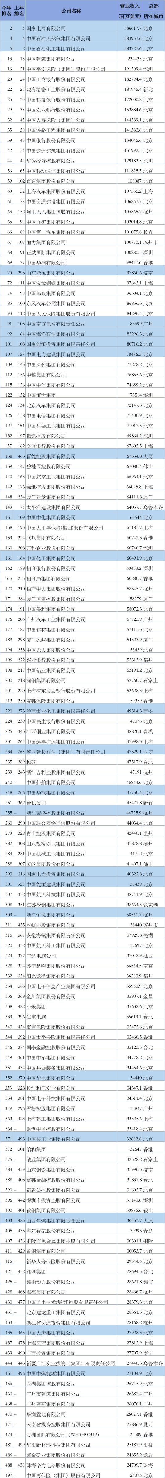 今年的500強榜單里,排名前五的企業(yè)中中國企業(yè)占三家,分別為:排名第二的國家電網(wǎng)有限公司、排名第四的中國石油天然氣集團有限公司、排名第五的中國石油化工集團有限公司。而中國南方電網(wǎng)公司今年升至91位。在五大發(fā)電集團當中,國家能源集團排名最高,位居101位。