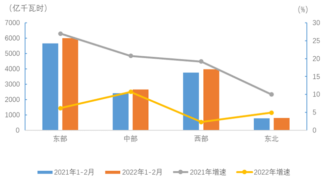 1-2月,東、中、西部和東北地區(qū)②全社會(huì)用電量分別為6006、2666、3986和809億千瓦時(shí),增速分別為6.2%、10.7%、2.3%和5.0%。