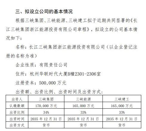 本網(wǎng)訊  4月19日,三峽集團浙江能源投資有限公司成立,法定代表人為陳逸詩,注冊資本50億元,經(jīng)營范圍包含:股權(quán)投資;風力發(fā)電技術(shù)服務(wù);太陽能發(fā)電技術(shù)服務(wù);生態(tài)恢復及生態(tài)保護服務(wù)等。股權(quán)穿透顯示,該企業(yè)由中國長江三峽集團有限公司、中國三峽建工(集團)有限公司、三峽能源共同持股。