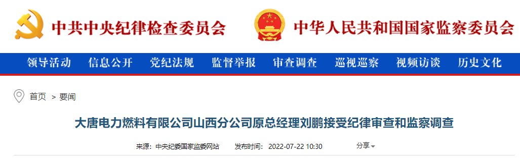 中央紀(jì)委國家監(jiān)委網(wǎng)站7月22日消息,據(jù)中國大唐集團(tuán)有限公司紀(jì)檢監(jiān)察組、山西省監(jiān)察委員會消息:大唐電力燃料有限公司山西分公司原總經(jīng)理劉鵬涉嫌嚴(yán)重違紀(jì)違法,目前正接受中國大唐集團(tuán)有限公司紀(jì)檢監(jiān)察組紀(jì)律審查和山西省太原市監(jiān)察委員會監(jiān)察調(diào)查。