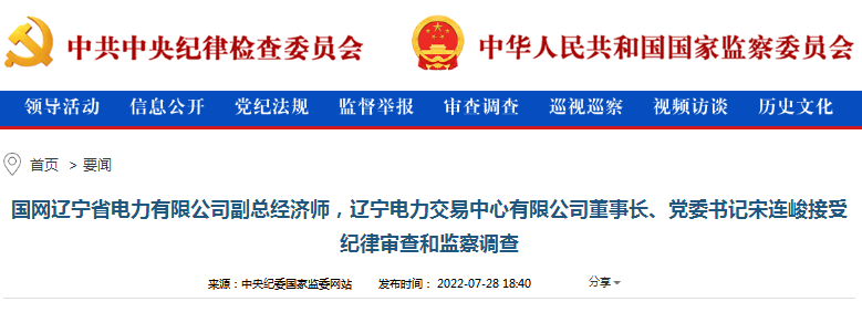 本網(wǎng)訊 中央紀(jì)委國(guó)家監(jiān)委網(wǎng)站7月28日消息,據(jù)中央紀(jì)委國(guó)家監(jiān)委駐國(guó)家電網(wǎng)有限公司紀(jì)檢監(jiān)察組、遼寧省紀(jì)委監(jiān)委消息:國(guó)網(wǎng)遼寧省電力有限公司副總經(jīng)濟(jì)師,遼寧電力交易中心有限公司董事長(zhǎng)、黨委書記宋連峻涉嫌嚴(yán)重違紀(jì)違法,目前正接受中央紀(jì)委國(guó)家監(jiān)委駐國(guó)家電網(wǎng)有限公司紀(jì)檢監(jiān)察組紀(jì)律審查和朝陽市監(jiān)察委員會(huì)監(jiān)察調(diào)查。