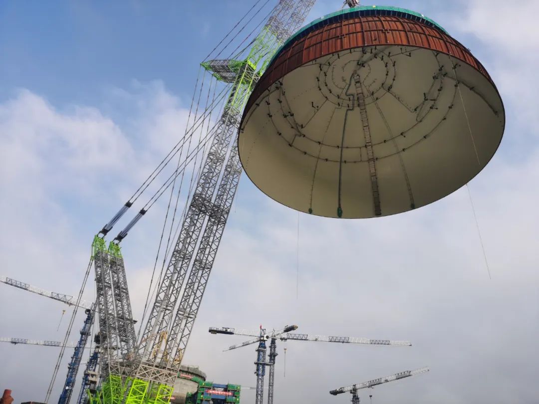 內(nèi)穹頂?shù)跹b是華龍一號(hào)核電工程建設(shè)的重要里程碑。穹頂位于核島頂部,主要功能是保證反應(yīng)堆廠房完整性和密封性,對(duì)放射性包容起關(guān)鍵性作用。吊裝當(dāng)天,隨著總指揮一聲令下,內(nèi)穹頂被緩緩吊離地面,經(jīng)過起鉤、變幅、提升、帶載行走、大臂逆時(shí)針回轉(zhuǎn)等一系列高精度動(dòng)作,精準(zhǔn)直達(dá)漳州核電2號(hào)機(jī)組反應(yīng)堆廠房上方,隨后緩慢下降,經(jīng)調(diào)整無誤后,平穩(wěn)落鉤就位在安全殼鋼襯里上。