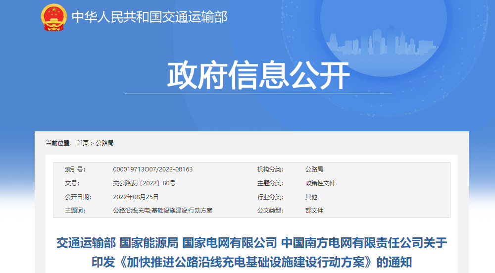 交通運(yùn)輸部 國(guó)家能源局 國(guó)家電網(wǎng)有限公司 中國(guó)南方電網(wǎng)有限責(zé)任公司關(guān)于印發(fā)《加快推進(jìn)公路沿線充電基礎(chǔ)設(shè)施建設(shè)行動(dòng)方案》的通知