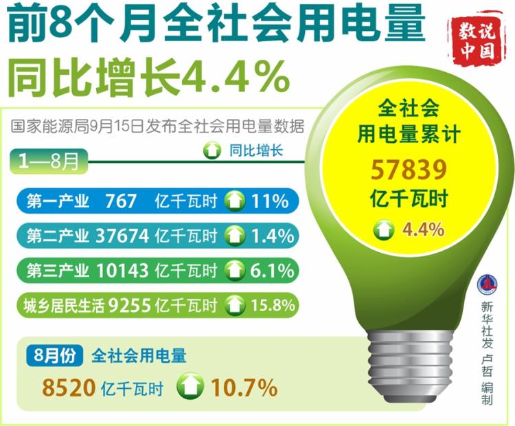 國家能源局:前8個月全社會用電量同比增長4.4%