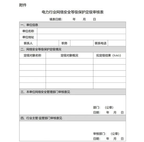 第九條 電力企業(yè)辦理網(wǎng)絡(luò)安全等級保護定級審核手續(xù)時,應(yīng)當(dāng)提交《電力行業(yè)網(wǎng)絡(luò)安全等級保護定級審核表》(詳見附件),含各定級對象的定級報告及專家評審意見。