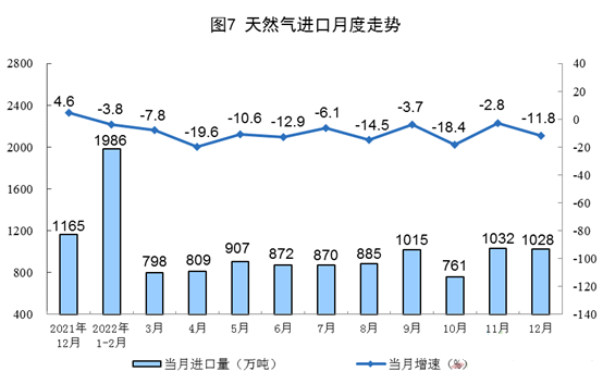 天然氣生產(chǎn)增速有所放緩,進(jìn)口降幅擴(kuò)大。12月份,生產(chǎn)天然氣204億立方米,同比增長(zhǎng)6.5%,增速比上月放緩2.1個(gè)百分點(diǎn),日均產(chǎn)量6.6億立方米。進(jìn)口天然氣1028萬(wàn)噸,同比下降11.8%,降幅比上月擴(kuò)大9.0個(gè)百分點(diǎn)。