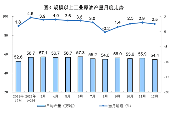 原油生產(chǎn)保持穩(wěn)定,進(jìn)口增速回落。12月份,生產(chǎn)原油1687萬(wàn)噸,同比增長(zhǎng)2.5%,增速比上月放緩0.4個(gè)百分點(diǎn),日均產(chǎn)量54.4萬(wàn)噸。進(jìn)口原油4807萬(wàn)噸,同比增長(zhǎng)4.2%,增速比上月回落7.6個(gè)百分點(diǎn)。