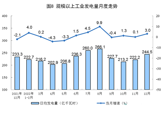 電力生產(chǎn)增速加快。12月份,發(fā)電7579億千瓦時(shí),同比增長(zhǎng)3.0%,增速比上月加快2.9個(gè)百分點(diǎn),日均發(fā)電244.5億千瓦時(shí)。2022年,發(fā)電8.4萬(wàn)億千瓦時(shí),同比增長(zhǎng)2.2%。