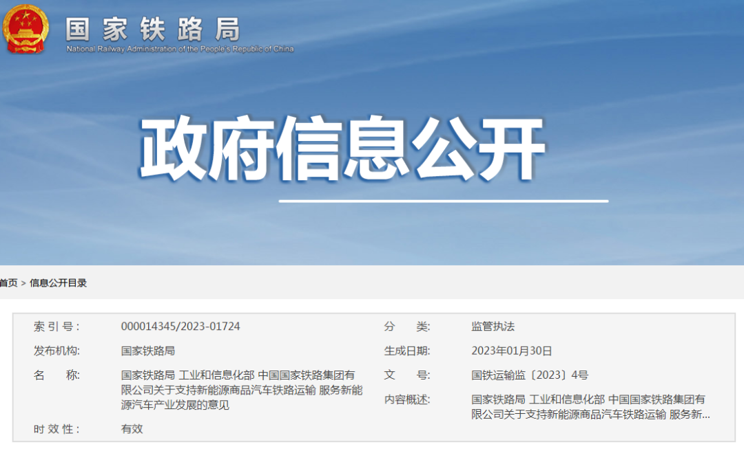 國家鐵路局 工業(yè)和信息化部 中國國家鐵路集團有限公司關于支持新能源商品汽車鐵路運輸 服務新能源汽車產(chǎn)業(yè)發(fā)展的意見