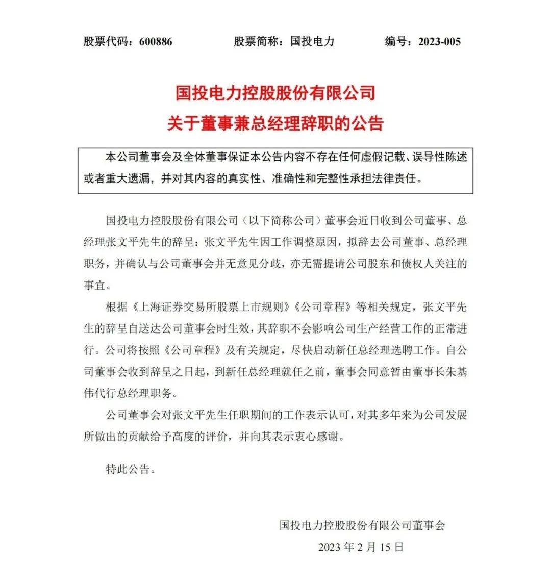 2月15日,國投電力發(fā)布關(guān)于董事兼總經(jīng)理辭職的公告。公告顯示,董事會(huì)近日收到公司董事、總經(jīng)理張文平先生的辭呈,張文平因工作調(diào)整原因,擬辭去公司董事、總經(jīng)理職務(wù),并確認(rèn)與公司董事會(huì)并無意見分歧,亦無需提請公司股東和債權(quán)人關(guān)注的事宜。