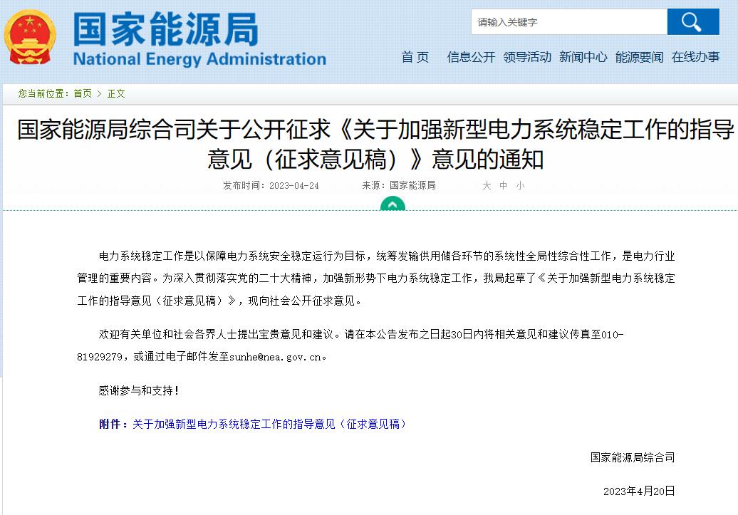 國家能源局綜合司關于公開征求《關于加強新型電力系統(tǒng)穩(wěn)定工作的指導意見(征求意見稿)》意見的通知