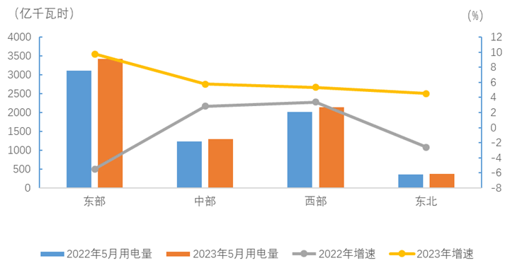 5月份,東、中、西部和東北地區(qū)全社會(huì)用電量增速分別為9.7%、5.8%、5.3%和4.5%。
