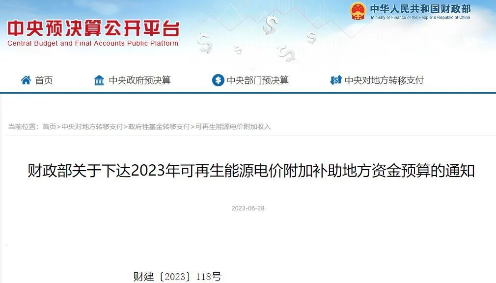 6月28日,財(cái)政部發(fā)布《關(guān)于下達(dá)2023年可再生能源電價(jià)附加補(bǔ)助地方資金預(yù)算的通知》(簡(jiǎn)稱《通知》)。