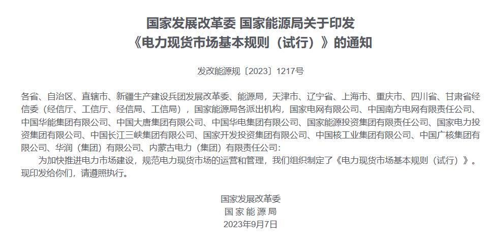 據(jù)國(guó)家發(fā)改委網(wǎng)站9月18日消息,國(guó)家發(fā)改委、國(guó)家能源局發(fā)布關(guān)于印發(fā)《電力現(xiàn)貨市場(chǎng)基本規(guī)則(試行)》的通知。