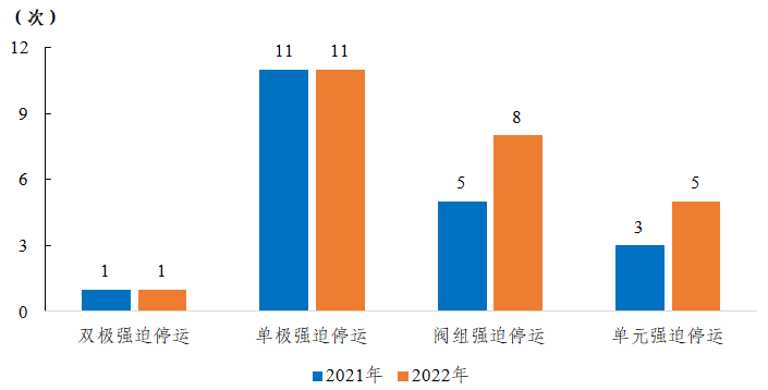 2022年,納入電力可靠性統(tǒng)計的直流輸電系統(tǒng)發(fā)生25次強迫停運,其中雙極強迫停運1次,與上一年持平;單極強迫停運11次,與上一年持平;閥組強迫停運8次,同比增加3次;單元強迫停運5次,同比增加2次。各系統(tǒng)強迫停運的等效停運小時累計值為480.57小時。
