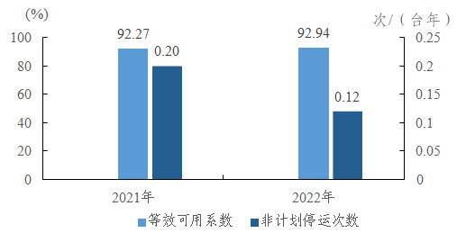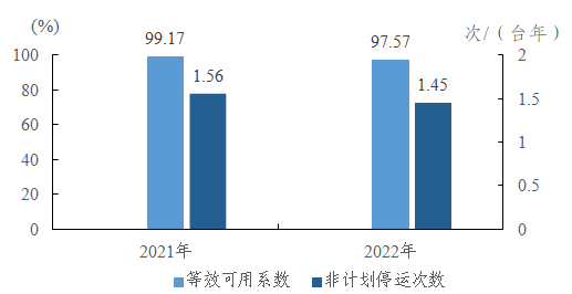 風(fēng)電機組等效可用系數(shù)為97.57%,同比下降1.60個百分點;非計劃停運1.45次/臺年,同比降低0.11次/臺年。