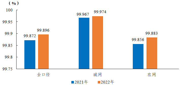 2022年,全國用戶平均供電可靠率99.896%,同比上升0.025個百分點,其中,城網(wǎng)99.974%,農(nóng)網(wǎng)99.883%。城網(wǎng)與農(nóng)網(wǎng)相差0.091個百分點。