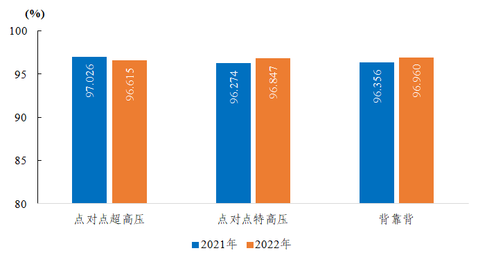 2022年,納入電力可靠性統(tǒng)計的點對點超高壓直流輸電系統(tǒng)能量可用率為96.615%,同比下降0.411個百分點;點對點特高壓直流輸電系統(tǒng)能量可用率為96.847%,同比上升0.573個百分點;背靠背直流輸電系統(tǒng)能量可用率為96.960%,同比上升0.604個百分點。