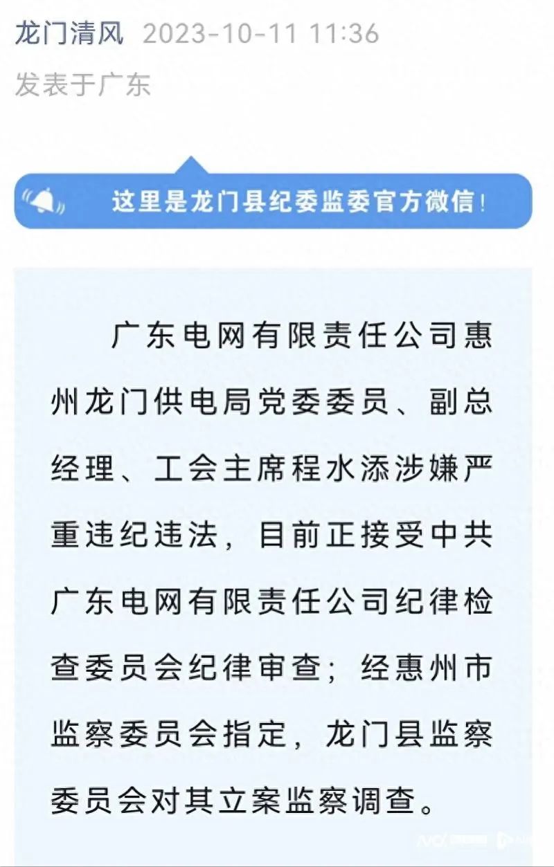 南都訊 記者黃海林 10月11日,惠州市龍門縣紀(jì)委監(jiān)委官方微信“龍門清風(fēng)”發(fā)布消息:廣東電網(wǎng)有限責(zé)任公司惠州龍門供電局黨委委員、副總經(jīng)理、工會主席程水添,廣東電網(wǎng)有限責(zé)任公司惠州龍門供電局六級職員林偉平涉嫌嚴(yán)重違紀(jì)違法,目前正接受中共廣東電網(wǎng)有限責(zé)任公司紀(jì)律檢查委員會紀(jì)律審查;經(jīng)惠州市監(jiān)察委員會指定,龍門縣監(jiān)察委員會對他們立案監(jiān)察調(diào)查。