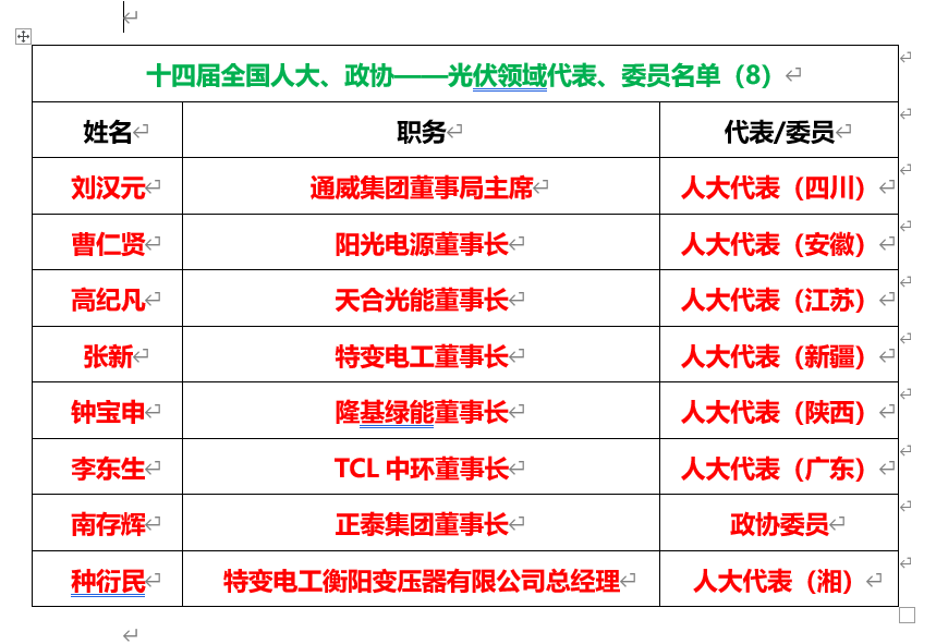 光伏領(lǐng)域共有8位行業(yè)領(lǐng)袖當(dāng)選十四屆全國(guó)人大代表、政協(xié)委員,數(shù)量創(chuàng)歷年之最。其中,特變電工有2人當(dāng)選,單家公司最多。
