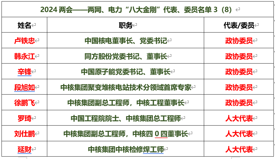 電力“八大金剛”代表委員名單: