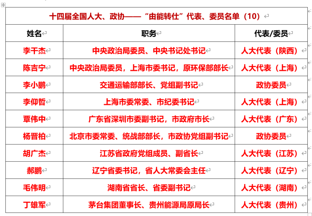 “由能轉(zhuǎn)仕”的十四屆全國(guó)人大代表、政協(xié)委員有10人,其中全國(guó)人大代表8人,政協(xié)委員2人。如中央政治局委員、中央書(shū)記處書(shū)記李干杰,曾任生態(tài)環(huán)境部原部長(zhǎng)、黨組書(shū)記,中央政治局委員、上海市委書(shū)記陳吉寧曾任環(huán)保部部長(zhǎng),交通運(yùn)輸部部長(zhǎng)李小鵬曾任中國(guó)華能總經(jīng)理,上海市委常委、紀(jì)委書(shū)記李仰哲曾任國(guó)家能源局副局長(zhǎng),深圳市長(zhǎng)覃偉中曾任中國(guó)石油副總經(jīng)理,遼寧省委書(shū)記郝鵬曾任國(guó)務(wù)院國(guó)資委主任,江蘇省副省長(zhǎng)胡廣杰曾任中國(guó)海油副總經(jīng)理,湖南省省長(zhǎng)毛偉明曾任國(guó)家電網(wǎng)董事長(zhǎng),丁雄軍曾任貴州能源局原局長(zhǎng)。