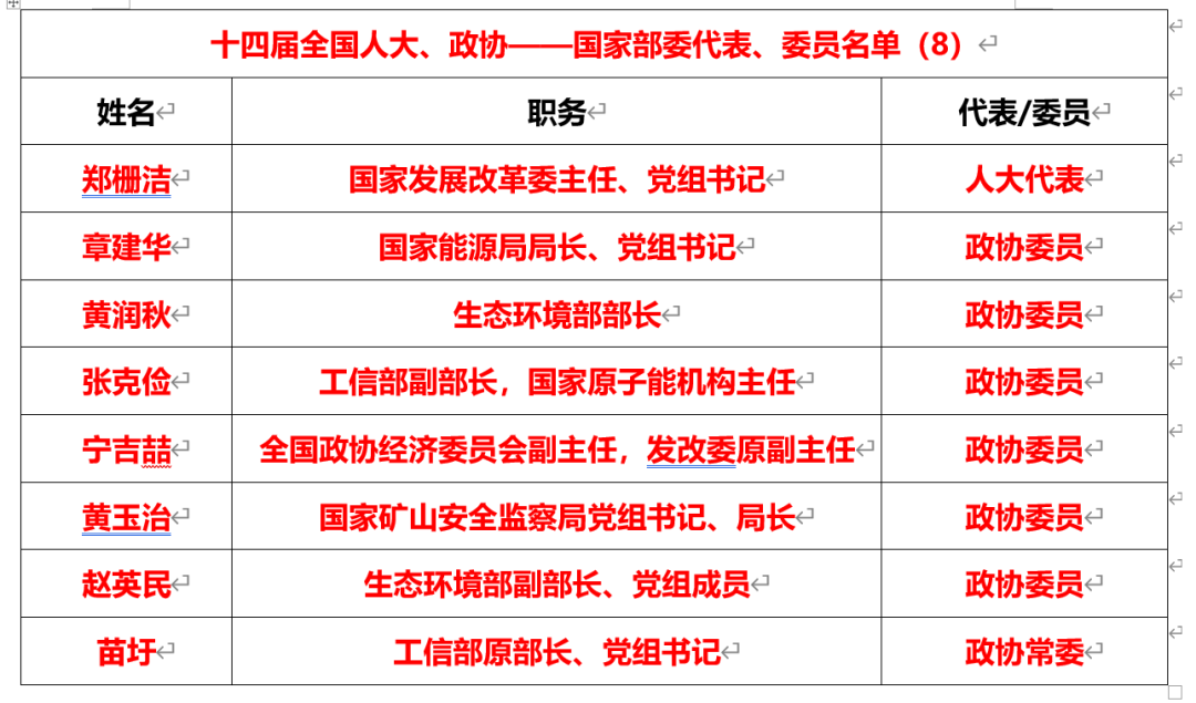 國(guó)家部委層面,有國(guó)家發(fā)展改革委黨組書(shū)記、主任鄭柵潔,生態(tài)環(huán)境部部長(zhǎng)黃潤(rùn)秋,國(guó)家能源局局長(zhǎng)、黨組書(shū)記章建華,國(guó)家礦山安全監(jiān)察局黨組書(shū)記、局長(zhǎng)黃玉治,工信部副部長(zhǎng),國(guó)家原子能機(jī)構(gòu)主任張克儉,全國(guó)政協(xié)經(jīng)濟(jì)委員會(huì)副主任,生態(tài)環(huán)境部副部長(zhǎng)、黨組成員趙英民,國(guó)家發(fā)改委原副主任寧吉喆,工信部原部長(zhǎng)、黨組書(shū)記苗圩8人。