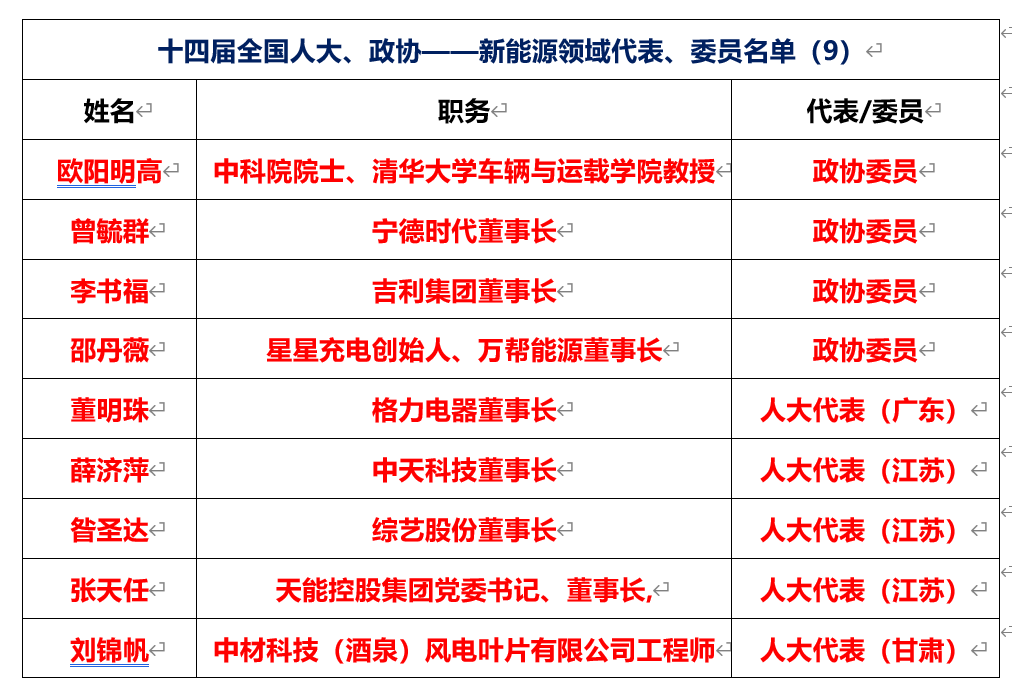 新能源領(lǐng)域有7人當(dāng)選十四屆全國(guó)人大代表、政協(xié)委員,格力電器董明珠、寧德時(shí)代曾毓群、吉利集團(tuán)李書(shū)福等人當(dāng)選。