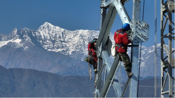 國網(wǎng)四川送變電施工人員在金沙江上游一湖北特高壓直流輸電工程建設現(xiàn)場組裝塔材。