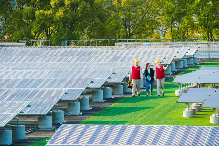 國網(wǎng)上海電力員工在光伏項(xiàng)目現(xiàn)場為客戶講解維護(hù)事宜。