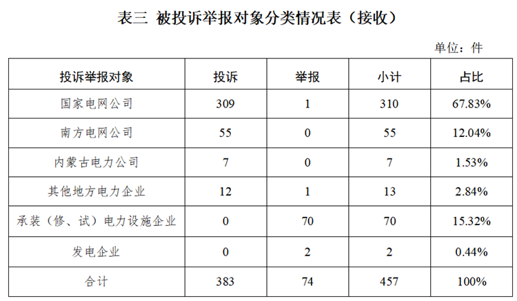 從被投訴舉報(bào)對(duì)象看,供電企業(yè)476件、占投訴舉報(bào)總數(shù)的89.82%,其中國(guó)家電網(wǎng)公司390件、占比73.58%;南方電網(wǎng)公司39件、占比7.36%;內(nèi)蒙古電力公司14件、占比2.64%;其他地方電力企業(yè)33件、占比6.24%;承裝(修、試)電力設(shè)施企業(yè)50件、占比9.43%;增量配電企業(yè)4件、占比0.75%。