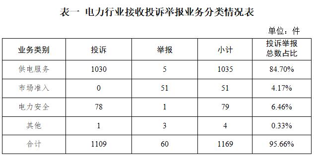 電力行業(yè)排在首位,數(shù)量為1169件、占投訴舉報總數(shù)的95.66%,主要集中在供電服務(wù)、電力安全、市場準入等方面。