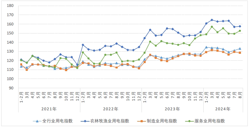 8月,農(nóng)林牧漁業(yè)用電指數(shù)為157.5,比2020年基期增長了57.5%,年均增長12.0%,同比增長4.6%,同比增速比上月回升3.1個百分點。