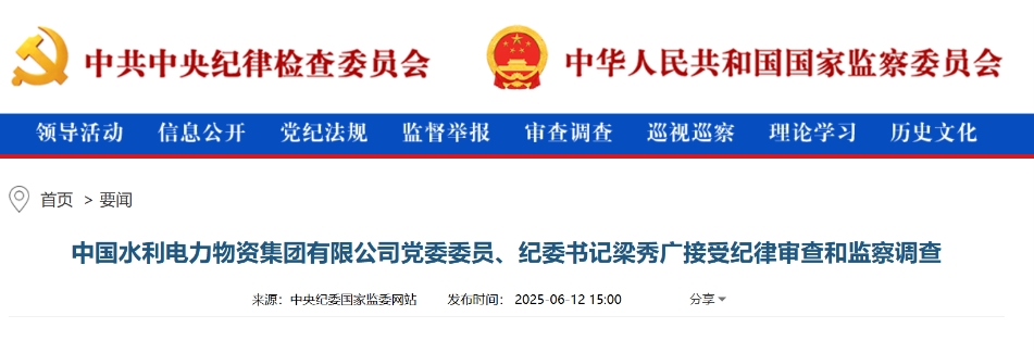 中央紀委國家監(jiān)委網(wǎng)站6月12日消息,據(jù)中央紀委國家監(jiān)委駐中國大唐紀檢監(jiān)察組、江蘇省紀委監(jiān)委消息:中國水利電力物資集團有限公司黨委委員、紀委書記梁秀廣涉嫌嚴重違紀違法,目前正接受中央紀委國家監(jiān)委駐中國大唐紀檢監(jiān)察組紀律審查和江蘇省鎮(zhèn)江市監(jiān)察委員會監(jiān)察調(diào)查。