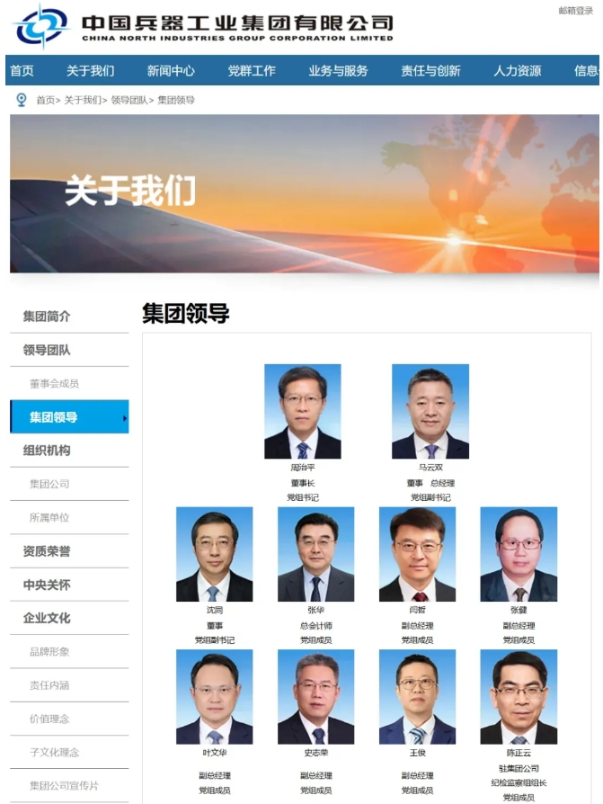 中國(guó)兵器工業(yè)集團(tuán)有限公司官網(wǎng)“集團(tuán)領(lǐng)導(dǎo)”一欄最新信息顯示,沈