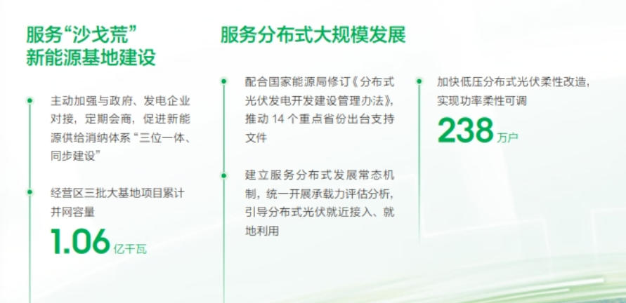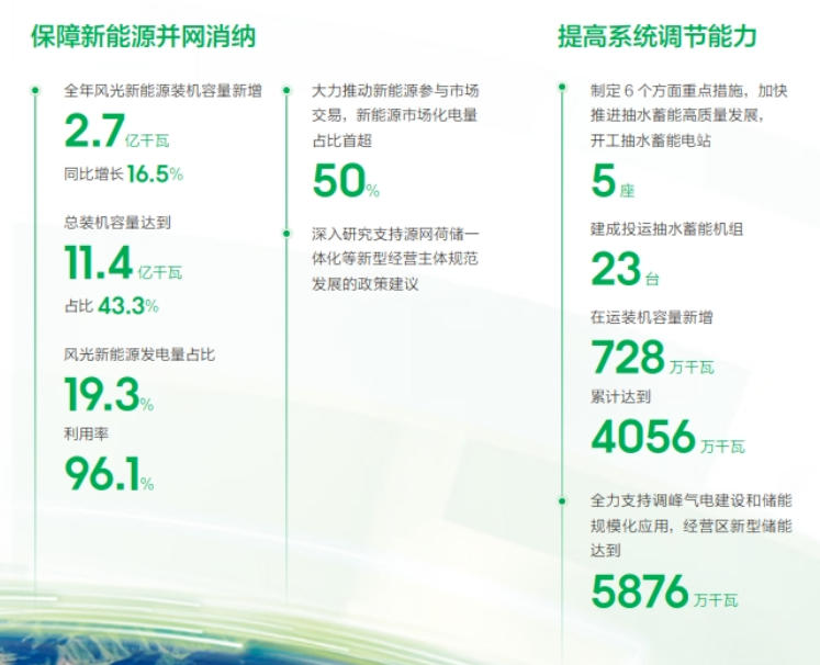 促進(jìn)新能源高質(zhì)量發(fā)展,經(jīng)營區(qū)三批大基地項(xiàng)目累計(jì)并網(wǎng)容量1.06億千瓦;加快低壓分布式光伏柔性改造,實(shí)現(xiàn)功率柔性可調(diào)238萬戶;全年風(fēng)光新能源裝機(jī)容量新增2.7億千瓦,同比增長16.5%;風(fēng)光新能源發(fā)電量占比19.3%,利用率96.1%;開工抽水蓄能電站5座,建成投運(yùn)抽水蓄能機(jī)組23臺(tái),在運(yùn)裝機(jī)容量累計(jì)達(dá)到4056萬千瓦;經(jīng)營區(qū)新型儲(chǔ)能達(dá)到5876萬千瓦。