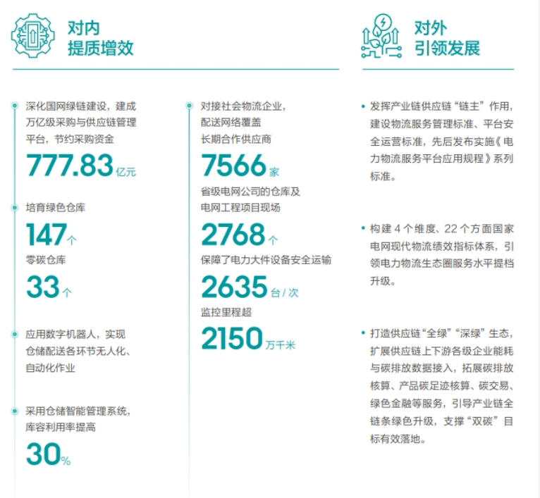 打造綠色數(shù)智供應(yīng)鏈,對(duì)內(nèi)深化國網(wǎng)綠鏈建設(shè),建成萬億級(jí)采購與供應(yīng)鏈管理平臺(tái),節(jié)約采購資金777.83億元;對(duì)外構(gòu)建4個(gè)維度、22個(gè)方面國家電網(wǎng)現(xiàn)代物流績效指標(biāo)體系,引領(lǐng)電力物流生態(tài)圈服務(wù)水平提檔升級(jí)。