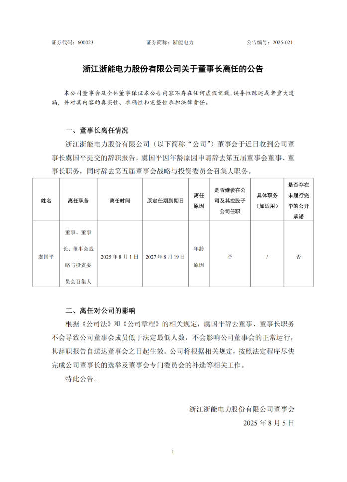 董事長虞國平因年齡原因申請辭去第五屆董事會董事及董事長職務,離任時間為2025年8月1日,原定任期到期日為2027年8月19日。