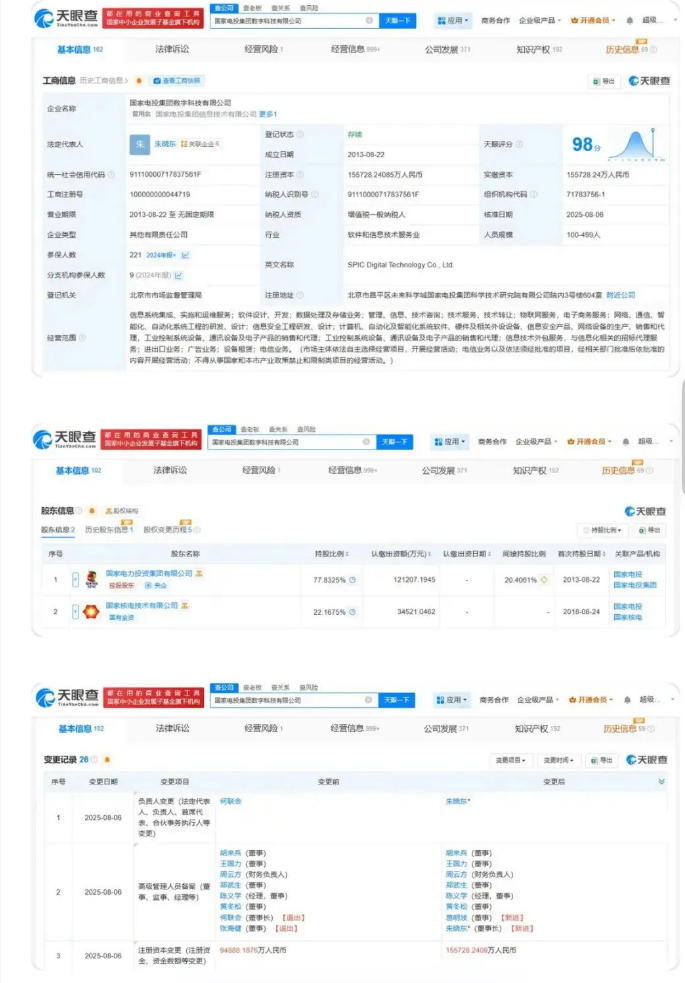 天眼查App顯示,近日,國(guó)家電投集團(tuán)數(shù)字科技有限公司發(fā)生工商變更,何聯(lián)會(huì)卸任法定代表人、董事長(zhǎng),由朱曉東接任,同時(shí)注冊(cè)資本由約9.49億人民幣增至約15.57億人民幣。