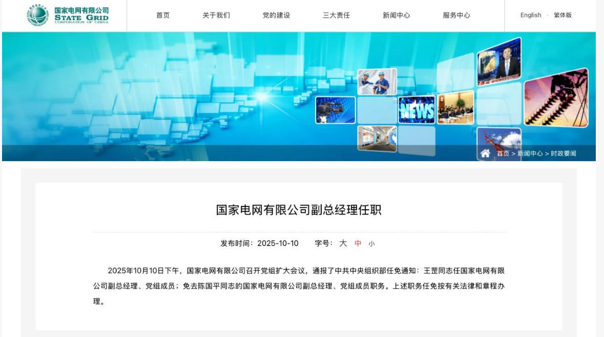2025年10月10日下午,國家電網(wǎng)有限公司召開黨組擴大會議,通報了中共中央組織部任免通知: